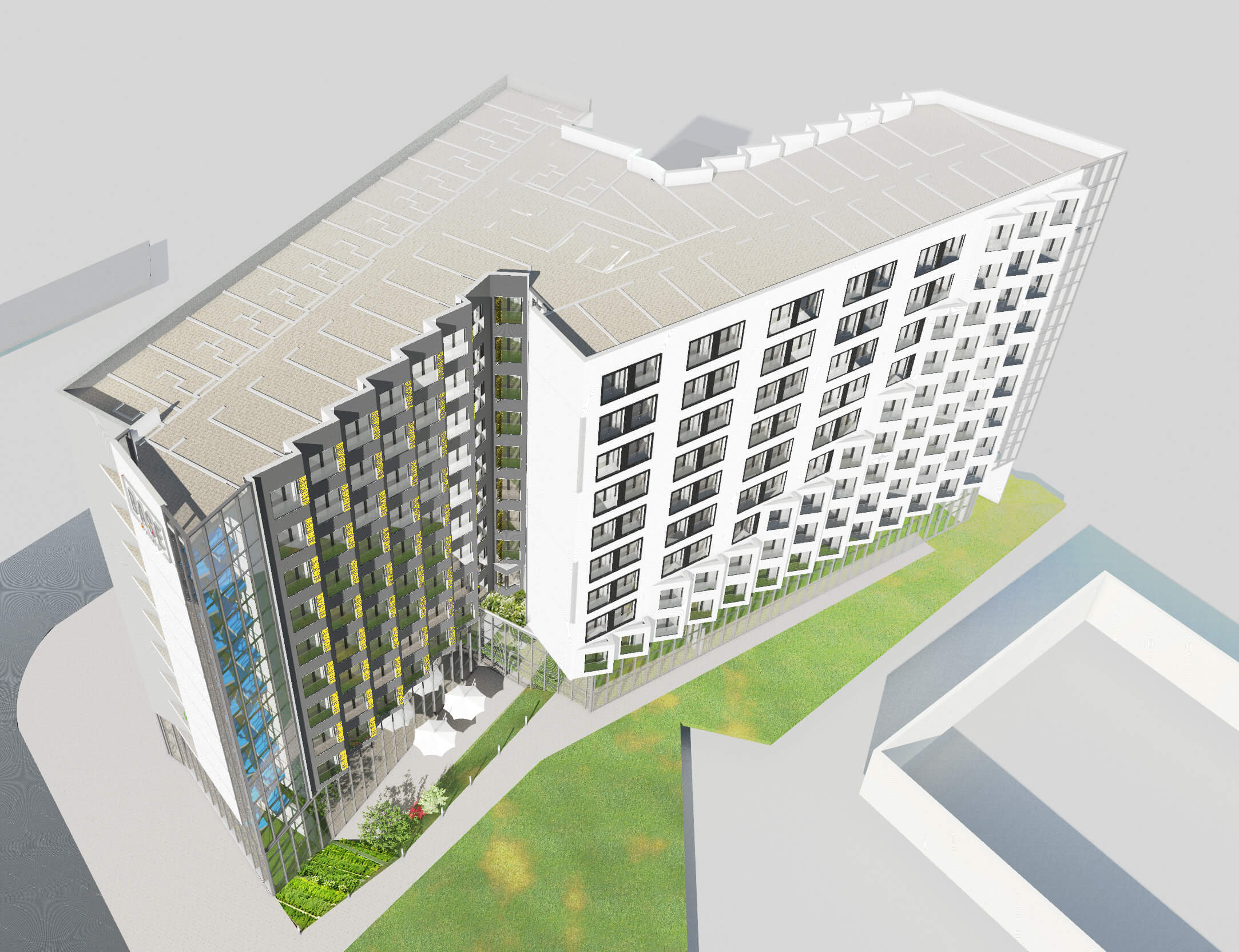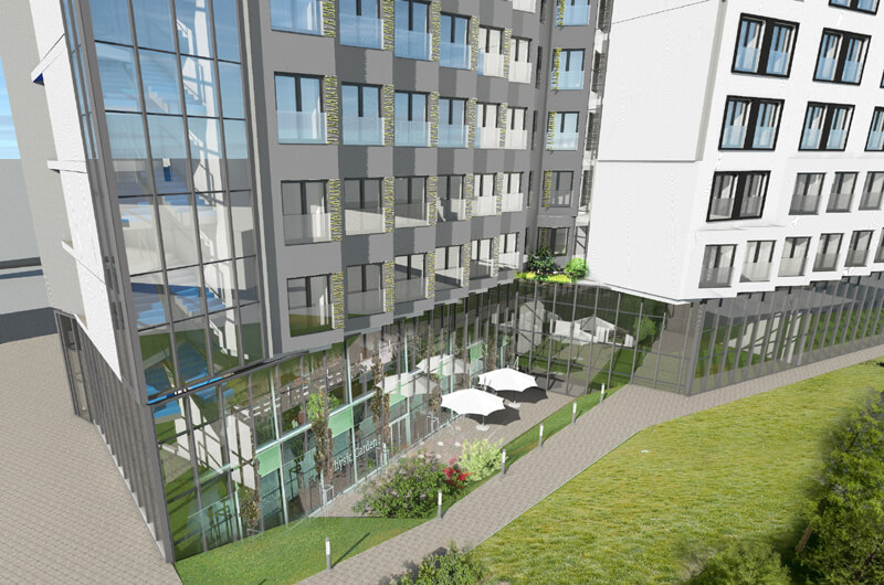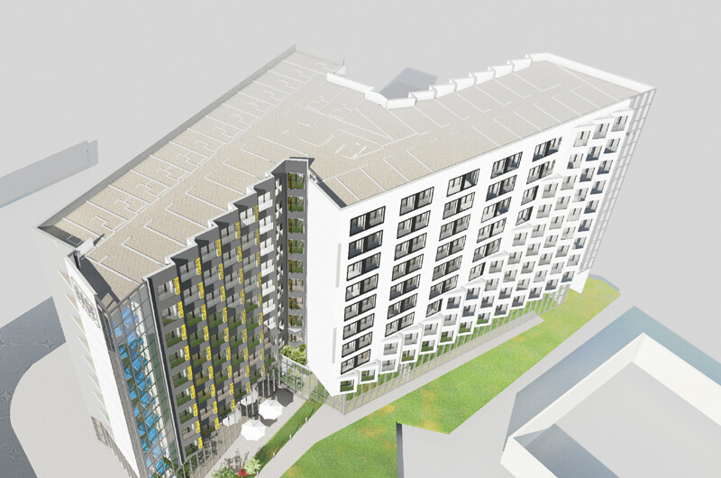 Projekt domu studenckiego przy ulicy Łopuszańskiej w Warszawie z 450 jednostkami pokojowymi.